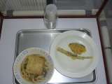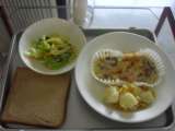 今日の献立は、牛乳、鮭のマヨネーズ焼き、コーンポテト、フレンチサラダです。