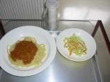 今日の献立は、スパゲッティミートソース、牛乳、じゃがいものハニーサラダです。