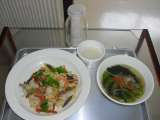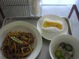 今日の献立は、ソース焼きそば、牛乳、きゅうりと大根のごま風味、チーズケーキです。