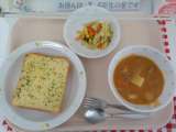 本日の給食は、ガーリックトースト・ポークシチュー・カラフルサラダ・牛乳です。