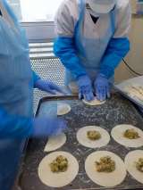 本日の給食は、麦ごはん・ジャンボ餃子・千切りサラダ・中華スープ・牛乳です。