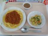 本日の給食は、スパゲッティミートソース・オリーブドレッシングサラダ・カフェオレゼ...