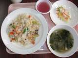 本日の給食は、エビチャーハン・辣白菜・わかめスープ・クランベリーゼリー・牛乳です...