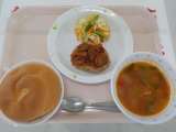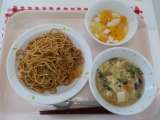 本日の給食は、ソース焼きそば・にらたまスープ・フルーツポンチミルク寒天入り・牛乳...