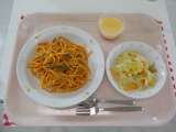 本日の給食は、スパゲッティナポリタン・コールスロー・手作りプリン・牛乳です。 ...