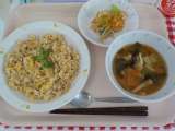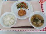 本日の給食は、麦ごはん・鶏肉のから揚げ・だいこんとひじきのサラダ・かきたま汁・牛...