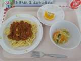 本日の給食は、スパゲッティソイミートソース・キャロットソースサラダ・あまなつ・牛...