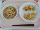 本日の給食は、きつねうどん・青のりポテト・野菜の梅ドレッシング・牛乳です。 食...