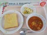 本日の給食は、ハニートースト・トマトシチュー・りんごドレッシングサラダ・牛乳です...