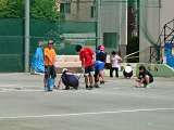 児童が下校したあと、全教職員での作業が行われています。 校庭をブラシで綺麗に馴ら...