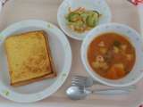本日の給食は、フレンチトースト・鶏肉のトマトソース煮・オニオンドレッシングサラダ...