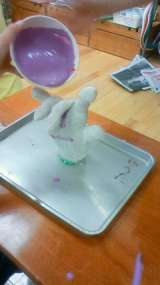 わかば学級高学年のサマースクール。さて、形の整った軍手にどろどろのねん土をかけて...