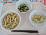 本日の給食は、きつねうどん・青のりポテト・和風サラダ・牛乳です。