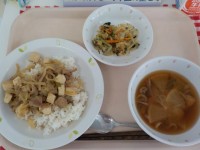 本日の給食は、豚丼・野菜ののりあえ・味噌汁・牛乳です。
