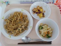 本日の給食は、塩やきそば・中華和え・おまめかりんとう・牛乳です。