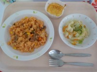 本日の給食は、チキンライス・キャベツサラダ・チーズケーキ・牛乳です。