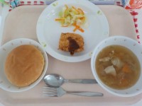 本日の給食は、丸パン・チキンカツ・きゃべつとにんじんのサラダ・野菜スープ・牛乳で...