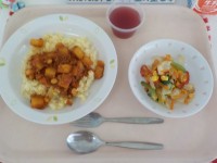 本日の給食は、チリビーンズライス・カラフルサラダ・ぶどうゼリー・牛乳です。