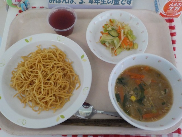 本日の給食は、みそラーメン・中華和え・ぶどうゼリー・牛乳です。