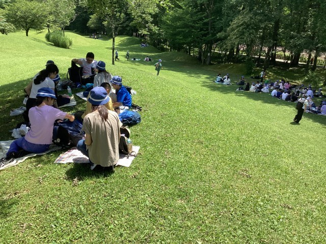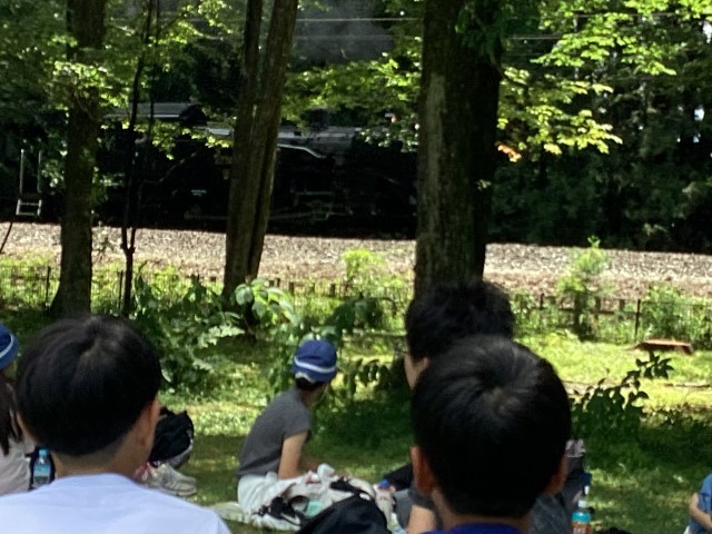 昼食のお弁当は、だいや公園でいただきました。シートを広げ、おうちの方の手づくりお弁当を空の下で食べるのは何とも格別です。少々暑いですが、木陰でゆっくりできました。予定外であった、蒸気機関車SL「大樹」が食事中にすぐ横を通過しました。ラッキーです。