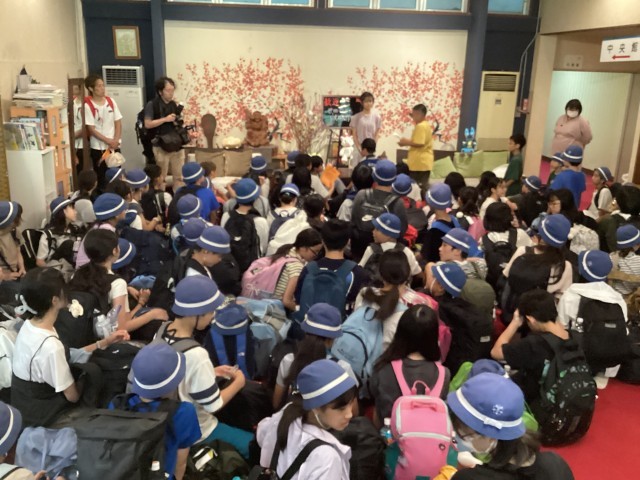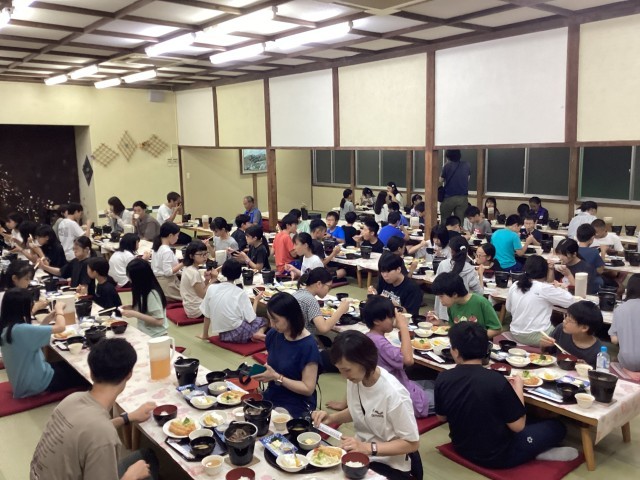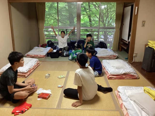 旅館に到着しました。ロビーで開園式をしました。部屋では、避難訓練のあと、友達と仲良く過ごしました。すぐに大浴場でお風呂に入り、疲れをとることができました。夕食もたくさん食べて嬉しい様子でした。