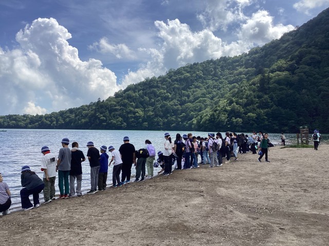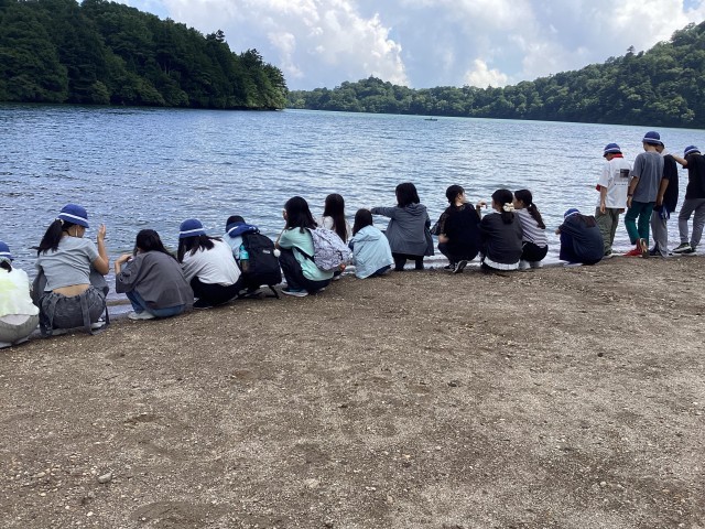 ハイキングは続きました。熊には出会わず安心です。緑の木々や大きな山々の中を歩き抜きました。途中でお弁当とアイスを食べました。昼食後は、湯の湖に行き、学年全体の集合写真を撮りました。水にも触れ、素晴らしい景色で最高でした。次は源泉に行きます。ハイキングは、まだつづく…。