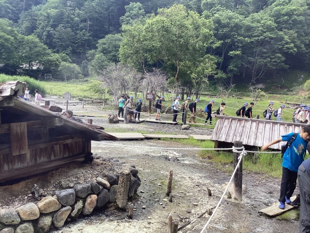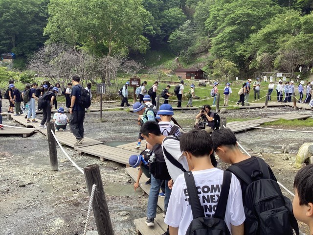 源泉の見学をしました。硫黄のにおいが何とも言えません。子どもたちの感想は「たまごがくさったみたい」「いいにおい」でした。実際に温泉を触ってみました。温度は様々です。今日のハイキング、みんな元気によく頑張りました。その後は、バスでいろは坂をおり、旅館に戻りました。お風呂とおみやげ買いです。いろいろ迷って、おみやげ選びは、つづく…。