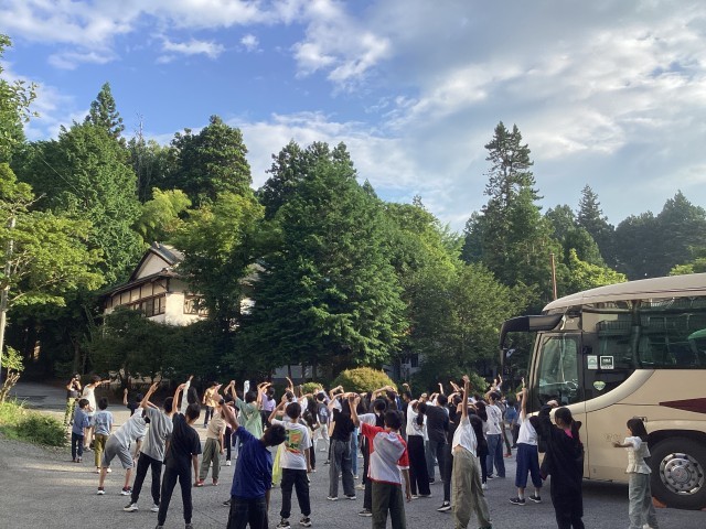 おはようございます。「にこにこ日光」最終日です。今日も清々しい朝です。東京との気温差が感じられます。景色もよいです。旅館前の近くには、先ほど野生の猿がいました。体操をして今日一日頑張ります。みんなとても元気です。3日目の思い出もたくさんつくりましょう。