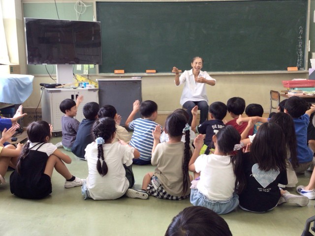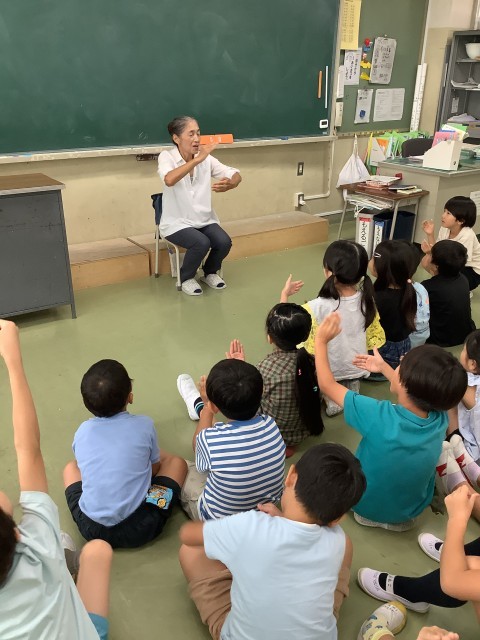 「いなほの会」の皆さんに来て頂きました。詩の朗読や、素話を想像を膨らませながら聞きました。手遊びや民謡、大型絵本の読み聞かせは参加型のものもあり、笑い声がたくさんあふれていました。