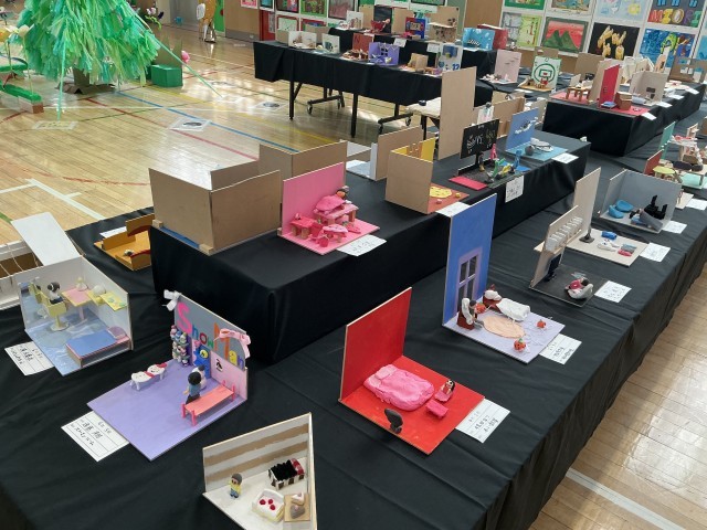 ・名前の文字を立体の奥行で表現した作品です。建造物に見立てた高学年らしい世界です。