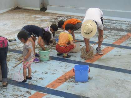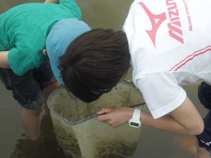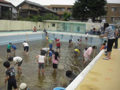 6月1日(土)に本校のプールで、烏山みずとみどりの会主催(烏山児童館協力)の水生生物観察会が行われました。子どもたちや保護者80名あまりが参加し、水を抜いて浅くなったプールの中でヤゴ捕りを行いました。今年はよく育っていて、体調2センチぐらいのヤゴが沢山捕れました。捕ったあとは、顕微鏡で巨大なヤゴを観察させてもらったり、水草と餌の赤虫を頂いたりもしました。