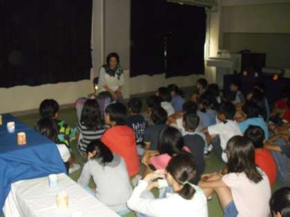 部屋を暗くして、いくつもキャンドルを灯したような優しいあかりの中で、高見さんの「語り」が始まりました。子どもたちは夏休みに日光林間学園で日光東照宮に行きます。その東照宮の隣の二荒山神社に伝わるお話、日光の民話を聞かせてくださいました。ほんの短い時間でしたが、お話の世界に入り込んだように真剣な表情で聞いている子どもたちでした。