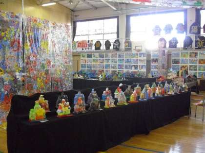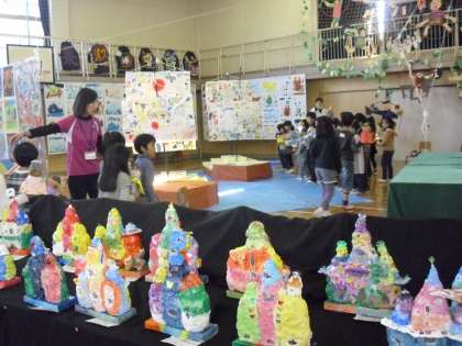 今週から体育館の飾りつけが始まり、体育館は、展覧会場へと一変しました。今日は一年生の立体作品が展示されました。