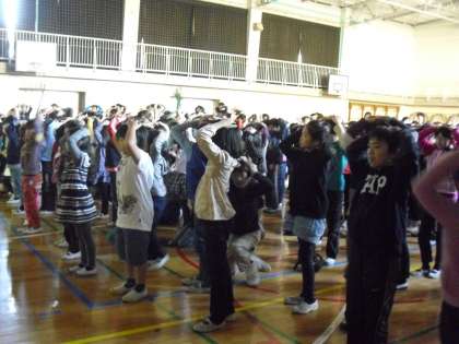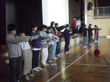 今日の児童集会は、運動委員会の発表でした。運動委員会の仕事の内容と、運動することの大切さを発表した後、全校児童で、運動チェックをしました。その場でできる5つの運動チェックです。4つ以上出来たら青信号、2〜3は黄信号、1つ以下は赤信号でした。寒くなってきましたが、外で元気よく運動して丈夫な体をつくりましょう。
