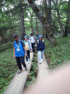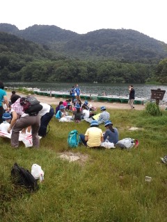 戦場が原のハイキングを終え、みんなそろってお昼ご飯です。湯ノ湖の湖畔は風が涼しく、半袖では寒いくらいです!