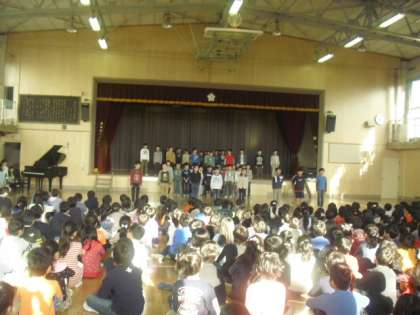 11日(木)音楽集会では3年生がクリスマスにちなんだ歌を2曲発表してくれました。、6年生の児童のピアノ伴奏で「きよしこの夜」と、振りを付けながら「あわてん坊のサンタクロース」を一所懸命歌いました。最後に全校児童で一緒に歌いました。あわてん坊のムサシサンタで体育館があふれました。とても楽しい音楽集会になりました。
