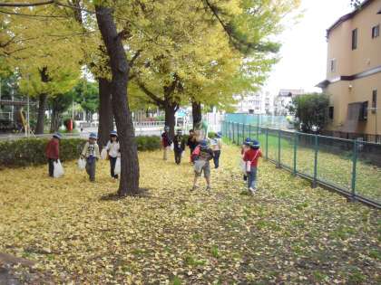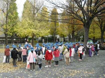 色づいたいちょうの葉っぱのじゅうたんの上を、友達と楽しそうに歩きながら、落ち葉やドングリをたっぷり拾いました。