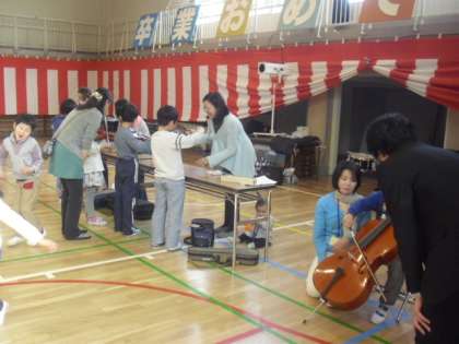 3月11日(水)午後1時30分から、プロのバイオリニスト等の演奏家をお招きし、弦楽器体験&鑑賞会を行いました。児童約80名、保護者約30名の参加がありました。