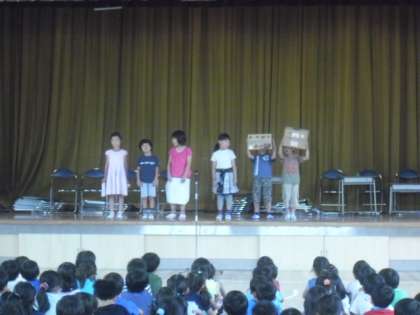 13日(土)のむさしまつりに向けて、11日(木)児童集会で、むさしまつり宣伝集会を行いました。自分たちのクラス・学年で出すお店の宣伝です。どのクラス・学年も工夫を凝らして、一生懸命練習してきたので、宣伝を聞いた後、むさしまつりがとても楽しみになりました。