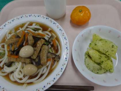 今日は冷やしうどんと青のりポテト、冷凍みかんでした。