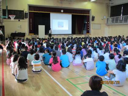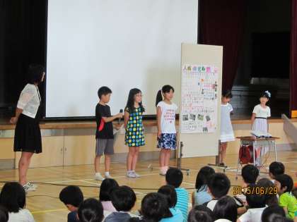 29日(月)朝礼では、副校長先生が戦後70年のお話とともに、「へいわってすてきだね」の絵本を読みました。その後、4年2組「人権の花運動」ボランティア人たちがみんなで作った人権の花新聞の報告をしてくれました。中央昇降口のところに新聞が掲示してあるので、ぜひ読んでください。