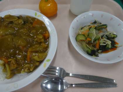 今日は夏野菜のカレーと海藻サラダ、冷凍みかんでした。