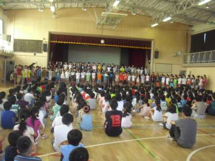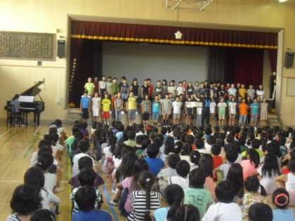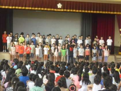 14日(火)は、1学期最後の音楽集会がありました。5年生「南風に乗って」6年生「Wish〜夢を信じて」をそれぞれ1曲ずつ歌いました。最後に5・6年生で、全員合唱「旅立ち」を歌ってくれました。暑い中一生懸命練習した成果を発表することができました。1〜4年生まで、上級生の歌声やハーモニーの素晴らしさに感動していました。歌が終わったあとは、大きな拍手で「ありがとう」を伝えることができました。5・6年生ありがとうございました。