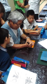 楽しい夕食の後は日光彫りの体験。真剣に作品作りに取り組んでいました。