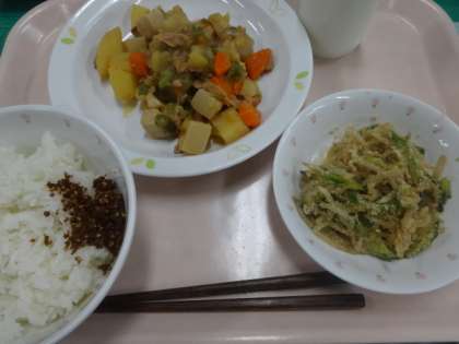 今日はごはん、かつおでんぶ、肉じゃが旨煮、ゴマ酢かけでした。