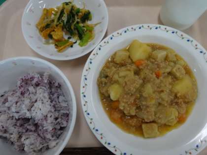 今日はゆかりごはん、じゃがいものそぼろ煮、カリカリ油あげと野菜のひたしでした。
