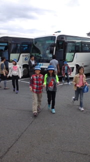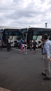 8時25分!バスは順調に進み三芳PAに到着しました。車酔いもなく、みんな元気です!バスの中ではバスレクが始まりました!