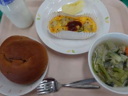 今日はスペイン風オムレツ、ベーコンと野菜のスープ煮、りんごでした。