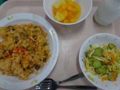 今日はチキンライス、じゃがいものハニーサラダ、フルーツカクテルでした。