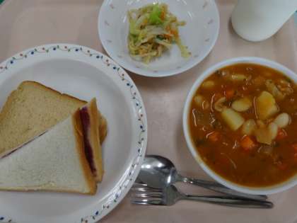 今日は2色ジャムサンド、ポークビーンズ、みそドレッシングサラダだした。